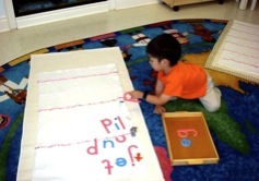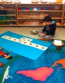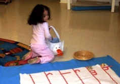 I-Spy games, sand paper letters, puppet shows, talking stick, stories, and logical puzzles are all used to make the child interested in language.